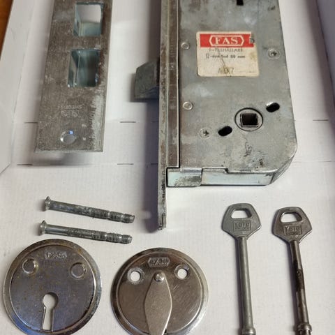 Ett parti med gamla beslag, lås och gångjärn. Perfekt för renovering av äldre dörrar och möbler.