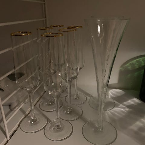 De är bestående av champagneglas och vinglas i guld. Glasen har en elegant design och är lämpliga för servering av champagne och vin. De har en lutning som man kan se på bild 2, längst upp. Totalt 8 glas för priset
