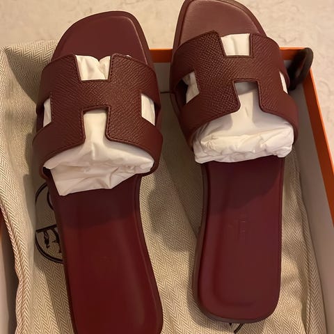 Jag säljer mina Hermés Oran sandaler i storlek 36. Tofflorna är i mycket fint skick då de köptes förra året 2024 och endast använts ett fåtal gånger under sommaren. Sandalerna kommer med kvitto, sina dustbags, presentband, box och även påse (påsen syns dock syns ej i bild).