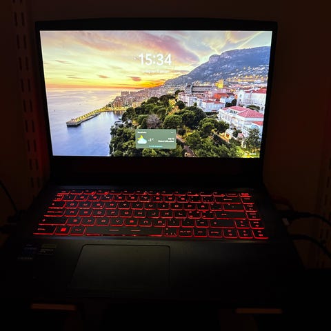 MSI Thin GF63 11SC gaminglaptop med Intel Core i5-12450H processor, svart färg och bärbar design. Laptopen är utrustad med en bakgrundsbelyst tangentbord och en skärm med smala kanter. Passar för spel och allmänt datoranvändning.