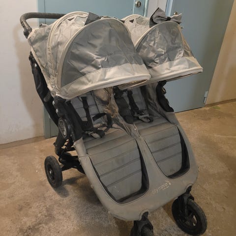 Dubbelvagn med avtagbar liggdel inkl resväska och fotstöd. Regnskyddet har blivit matt och är inte så genomskinligt längre, annars fungerar allt som det ska.