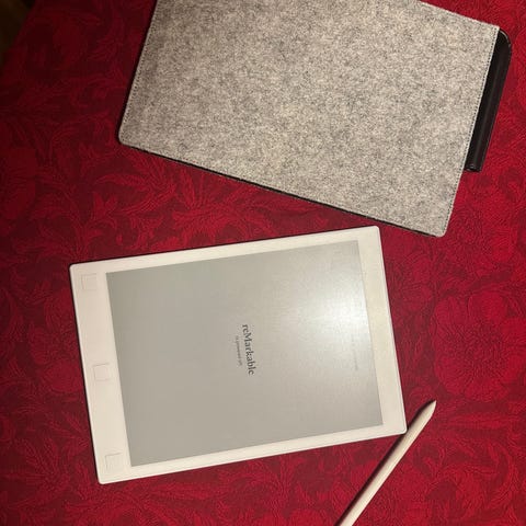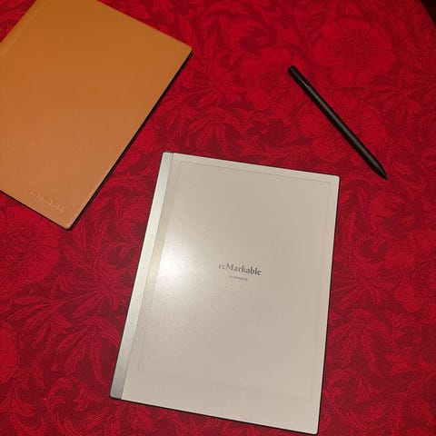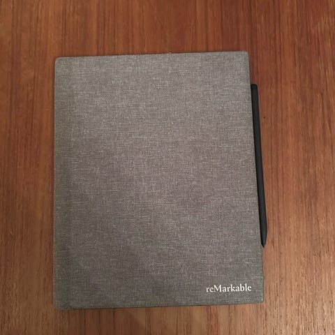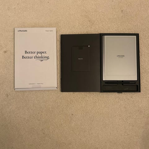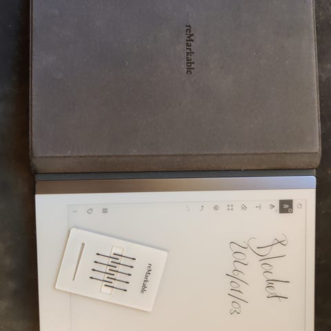 reMarkable 2 skrivplatta med folio-pärm, laddare, marker plus-penna och extra spetsar.