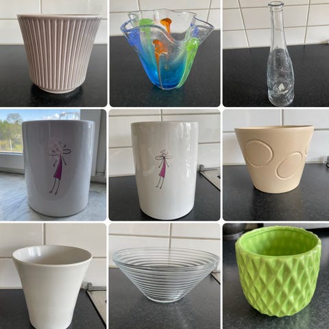 6 Blom/ytterkrukor, 2 höga ljusstakar/vaser, 5 glas i plast, 8 ljushållare, 1 vas, 1 svan.