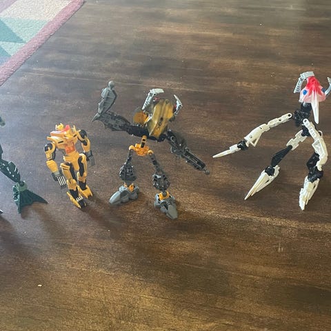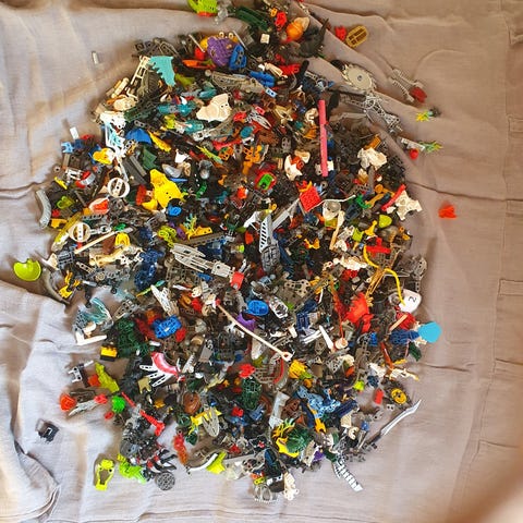 Innehåller flera färdigbyggda figurer/fordon samt lösa delar. De lösa bitarna kan vara delar som hör till byggena, men jag kan inte garantera att allt är komplett.