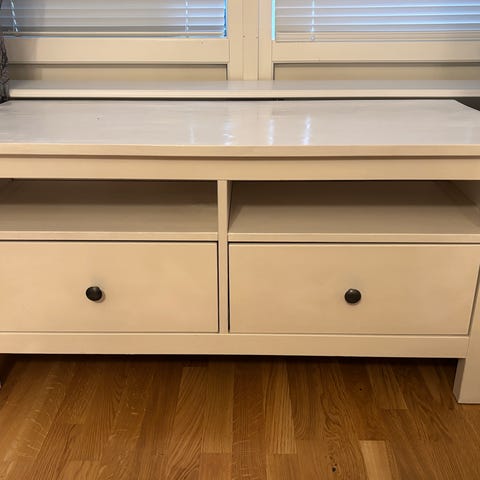 IKEA TV-bänk Hemnes i vitt med två lådor och öppna fack. Gjord i massivt trä. Synligt använd med små yttre skavanker men i övrigt hel. Märket ovanför högra lådan är en kvist som "läckt igenom". Finns att hämta i Mariefred.