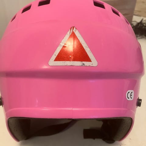 Grönt spänne som löser ut ifall barnet skulle bli hängande. Fungerar därför bra även som pulkahjälm/vid lek.