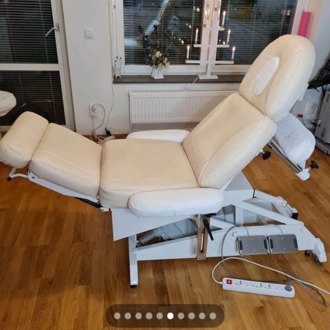 Justerbar behandlingsstol i vitt med fotstöd och armstöd. Stolen kan fällas ut för att användas som liggande behandlingsbänk.