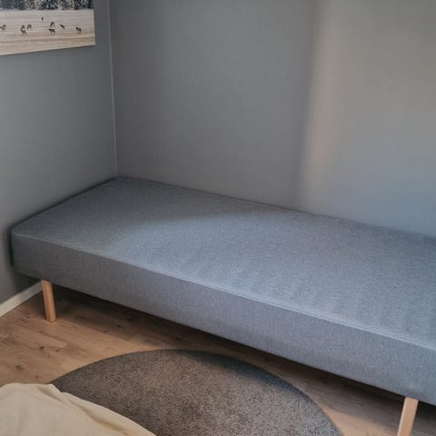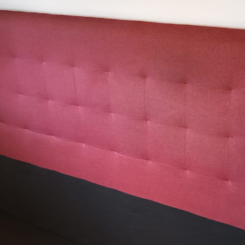 Grå sänggavel strlk 2,10 bredd , 1,22 höjd vilar på 2 ben, grått tyg med nackkuddar, köpt pp Sovabutiken