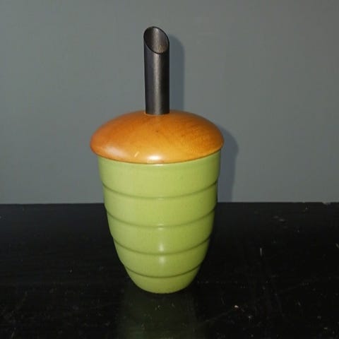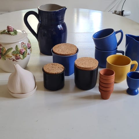 Föremålet du ser är en sockerströare från Höganäs Keramik. Den är en del av deras populära "Collection"-serie och har en mörkblå (ibland kallad vossblå eller indigoblå) keramisk behållare med ett trälock och en svart strötapp.