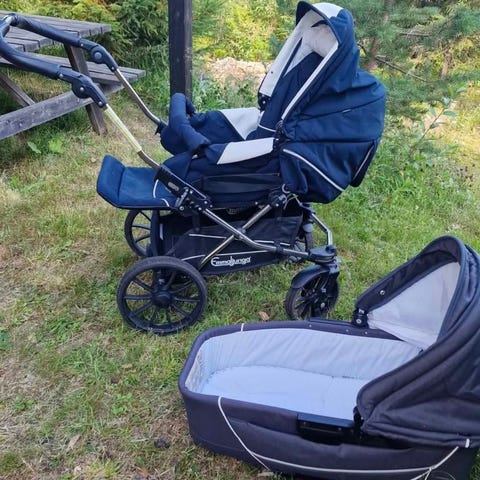 Emmaljunga Superviking barnvagn i svart/grå färg. Består av sittdel och liggdel med mjukt vadderad insida. Utrustad med justerbart handtag och säkerhetsbåge. Passar för barn och är anpassad för bekväm användning.