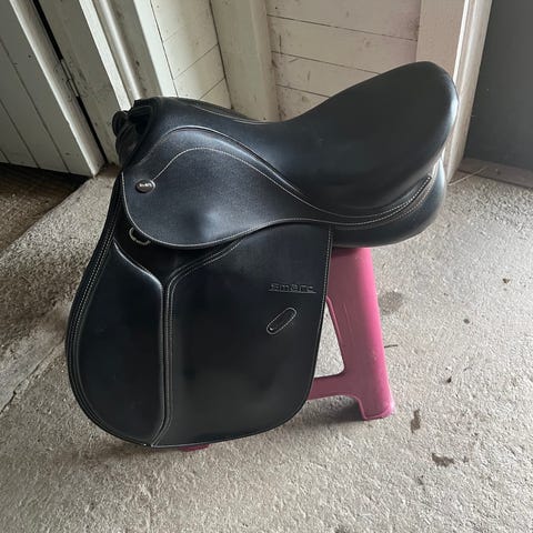 "Hoppsadel med smal midja i sitsen. Ovandel, kåpor och bossor i europeiskt läder. Sadelgjordsstroppar i kraftigt österrikist läder. Övriga delar av sadeln är i Quick CleanTM, ett slags konstläder som är väldigt lättskött. Syntetbom som man kan ändra vidden på genom uppvärmning, så att sadeln kan anpassas efter hästen om den ändrar form över ryggen. WoolFlex stoppning som består av latex i botten samt filt och 100% ren ull, vilket gör att sadeln kan stoppas om efter behov. Denna stoppningen ger en jämn tryckfördelning mot hästryggen och ger en close contact känsla. Passar hästar med lätt svängd rygg.” Mycket skön och trevlig sadel för både hoppning, uteritter och pass på ridbanan, passar många hästar. Ganska lätt eftersom den har plastbom samt att vissa delar består av konstläder. Kan skickas med PostNord (245kr)