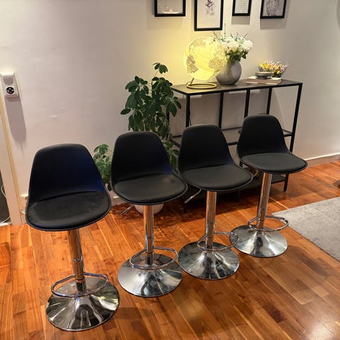 Jysk TAULOV barstol med grå tygklädsel och svart metallstomme. Stolen har justerbar höjd och fotstöd, vilket gör den lämplig för användning vid köksö eller bar men har tidigare även används vid sminkbord.