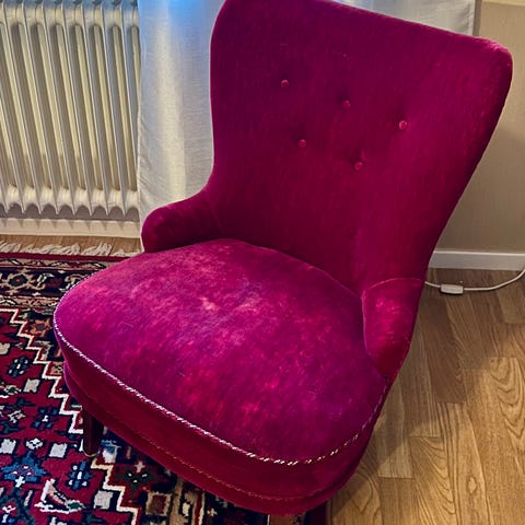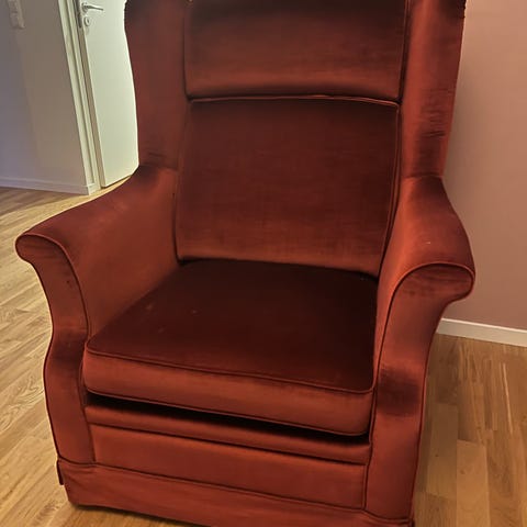 Två stycken vinröda sammetsfåtöljer av äldre modell, i det närmaste antika. Vet ej exakt år men gissningsvis från första halvan av 1900-talet. Finns även en liten hörnsoffa (samma tyg) som troligtvis är något äldre än fåtöljerna, samt ett runt bord. Fåtöljerna säljs antingen separat eller tillsammans med soffan och bordet. Mycket fin möbelgrupp som vi tyvärr inte har plats för.