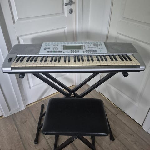 Casio CTK-100 keyboard med 61 tangenter, 100 inbyggda sånger och 100 rytmer. Utrustad med funktioner som volymkontroll, transponering, stämning och tempojustering. Har även olika ljudtoner.