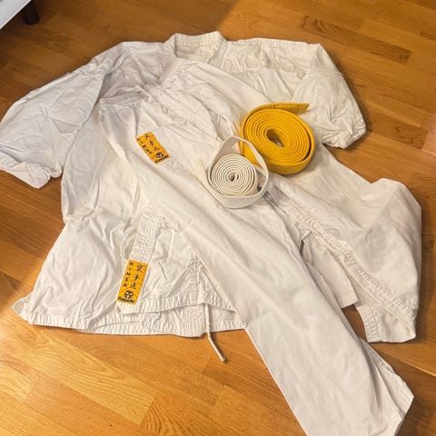 - 1 st. Dräkt stl. 180 med vitt och orange bälte 400 kr