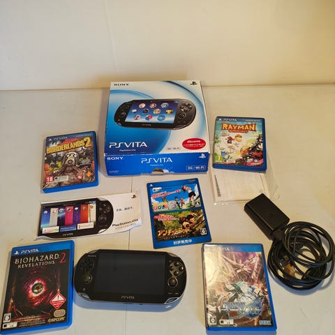 Sony PS Vita Handhållen Spelkonsol med 3G och Wi-Fi-anslutning i svart färg. Modellen är PCH-1004 och enheten levereras med originalförpackning och laddare. Konsolen har en pekskärm och flera kontrollknappar för spel.