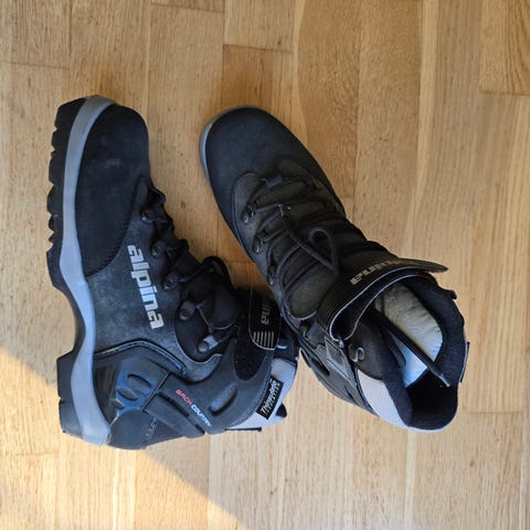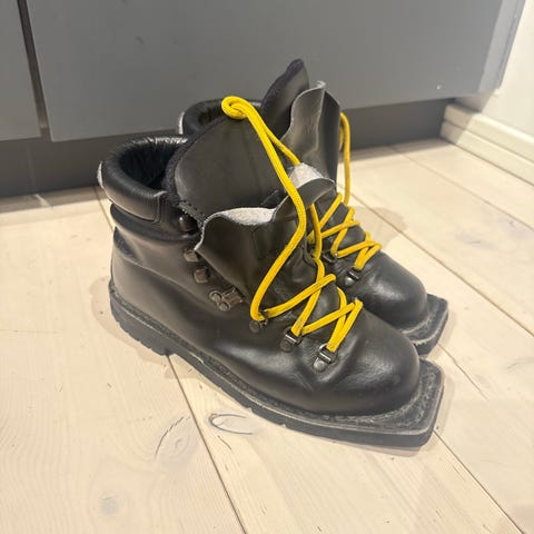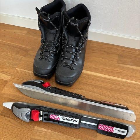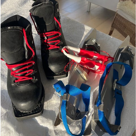 Vadderade pjäxor Telemark Crispi i skinn, sula Vibram, stl. 40, långfärdsskridskor, 50 cm långa för fast häl. Pjäxorna går till långfärdsskidor också med kabelbindning. Pjäxor 400, skridskor 100.