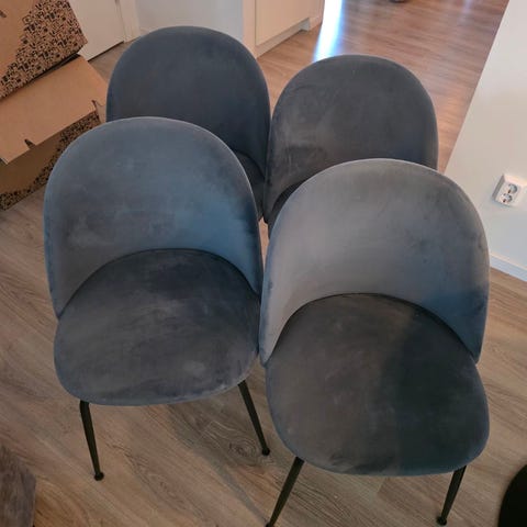 Säljer mina fina sammet stolar från Mio 6st rosa färg med guldiga ben alla för 2000kr. Dom är i nyskick men en av stolarna har en liten brännskada bild finns sist.