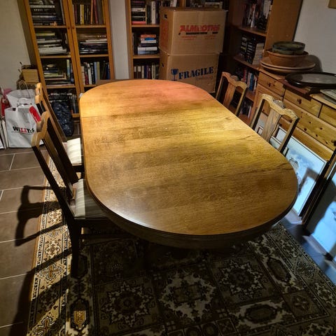 Mycket fint bord i ek. Stolarna säljs för sig. Kostat 12kkr. Sparsamt använt. En spricka i inläggs skivan