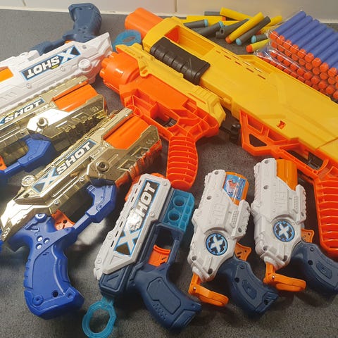 Lite mer än hälften av skotten är använda och kan behöva bytas för bäst funktion. Pistolerna i sig fungerar som nya. De två mindre måste man ladda skottfunktionen manuellt medan den stora har ett magasin och motor som gör att du kan skjuta automatiskt utan att ladda varje skott för sig.