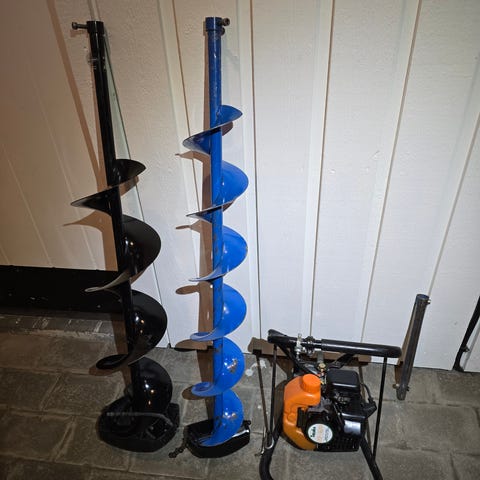 Motorborr med blå borrspiral. Utrustad med handtag för bättre grepp och kontroll. Används för att borra i mark eller is. Färgen på motorn är orange och svart.ring 070-3696904