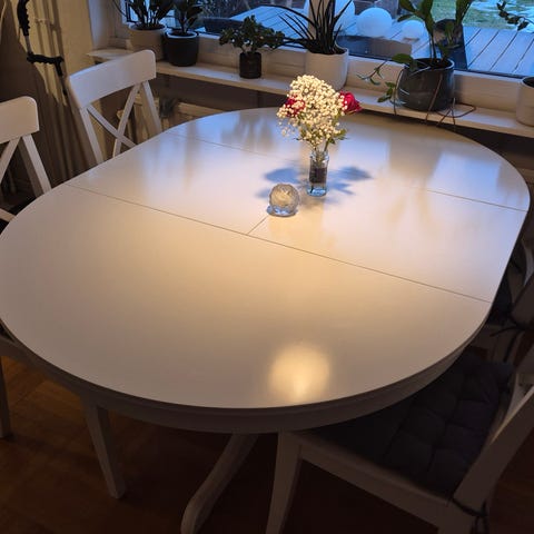 Ett charmigt och stabilt matgrupp i massivt trä med ljusbrun betsad bordsskiva och vita ben. Klassisk skandinavisk design som passar perfekt i små till medelstora matplatser. Slitstark, tidlös och idealisk för dagliga familjemåltider.
