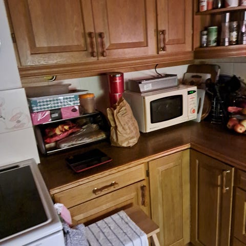 Kök med träskåp, spishäll, mikrovågsugn och kylskåp