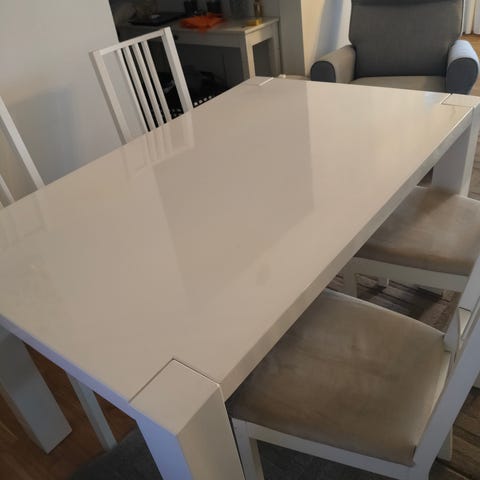Matgrupp med rund vitt bord och fyra blommönstrade stolsöverdrag