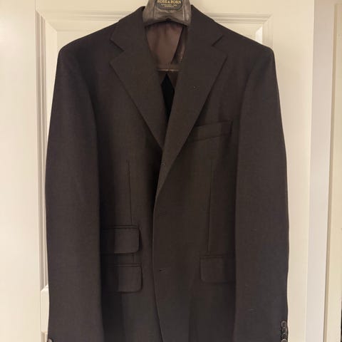 Letar du efter en klassisk kostym som ändå sticker ut? Då har du kommit rätt. Här finner du en diskret mörkgrön kostym i ull med rullad 3-2 knäppning från lyxvarumärket Rose & Born. Kavajen är tillverkad i italien och nypriset för liknande kostym ligger på över 15 000kr. Kostymen har eleganta detaljer som breda slag, side adjusters samt slag. Uppskattar storleken till 52/54. Se mått nedan.