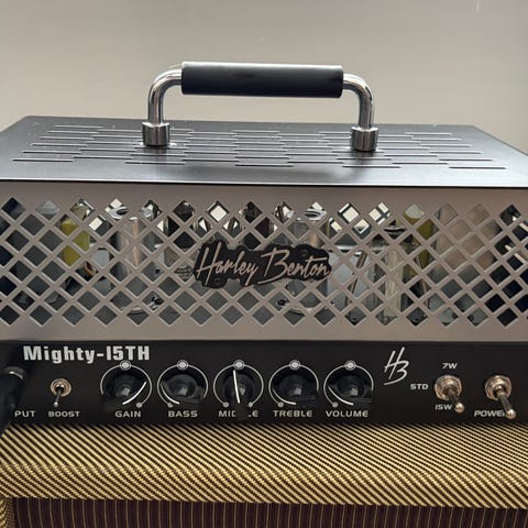 Harley Benton gitarrförstärkare i svart färg. Förstärkaren har ett robust yttre med bärhandtag på toppen och flera reglage på frontpanelen för justering av ljudet. Den är avsedd för användning med elgitarr.