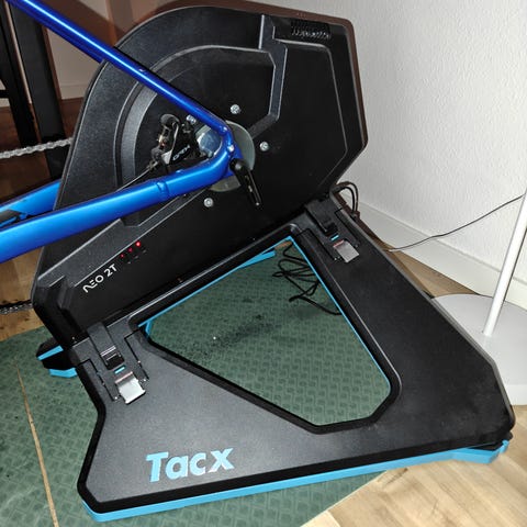 Tacx Genius med styrenhet och stöd för framhjulet. Observera att detta är den tidigaste modellen som inte uppgraderats för att vara FE-C kompatibel. För den datorkunnige kan detta dock göras med en gratisprogramvara och två anslutna FE-C adaptrar. Trainern kan då användas med t ex Zwift. Tacx egen programvara medföljer och kan användas direkt mot Trainern.
