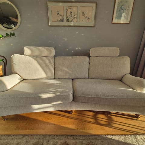 Säljer en bekväm och stilren 3-sits soffa i grå/brun nyans, komplett med matchande fotpall och två justerbara nackstöd. Soffan är djup och skön att sitta i och passar perfekt både för vardagsrum och TV-hörna.