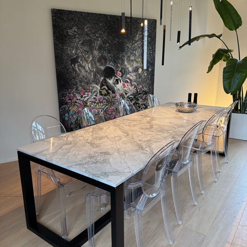 Vackert matsalsbord I glas. Plats för 6 +2 personer. Inga repor eller defekter. Svart underrede. Hämtas på plats, ta med bärhjälp.