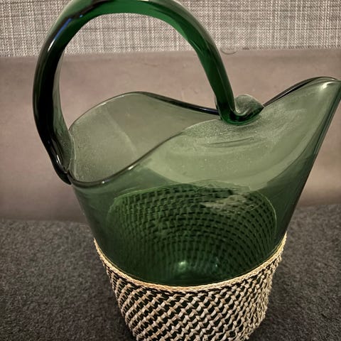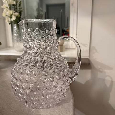 IKEA kanna och glas i glas. Kannan har en räfflad design och en pip för enkel upphällning. Väldigt tung! Glasen är små med en matchande räfflad design. Rejäla passar familjer.