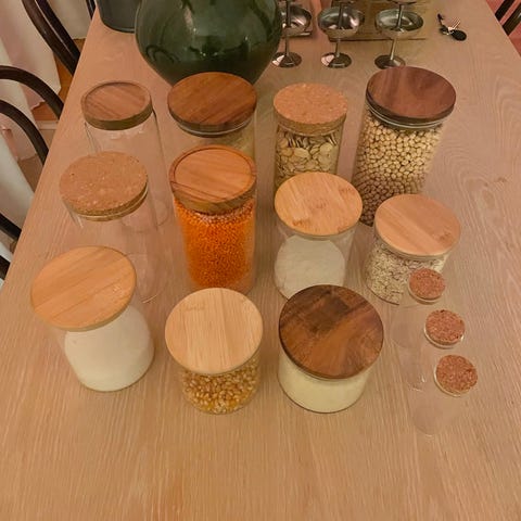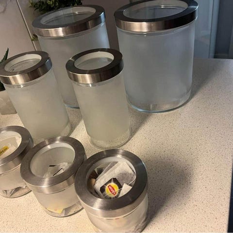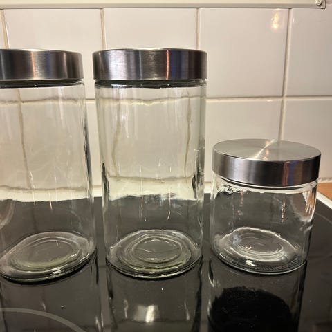 IKEA Förvara förvaringsburkar tillverkade i frostat glas med lock i metall. Burkarna finns i olika storlekar och är avsedda för köksförvaring av torrvaror eller annat. Designen är enkel och funktionell med tättslutande lock för att bevara innehållets fräschör.