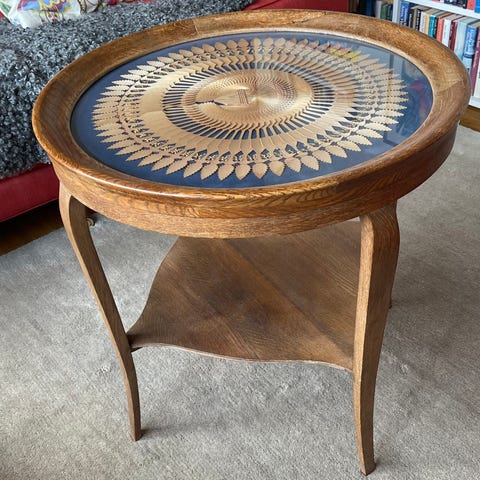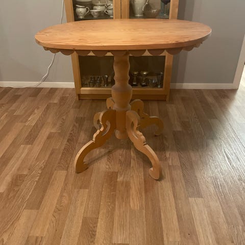 Runt matbord i trä med en klassisk design. Bordet har en rund bordsskiva och ett centralt pelarben som stöd. Passar för användning i matsal eller vardagsrum. Hämtas I Björklinge centrum