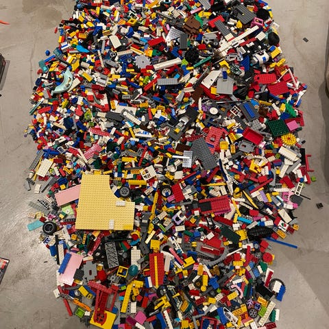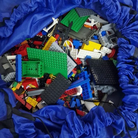 LEGO blandade bitar och figurer i olika färger och former. Innehåller byggstenar och minifigurer i varierande storlekar och material av plast. Levereras i en blå förvaringspåse med dragsko. Passar för barn och samlare. Delarna varierar från byggen av Frost, Minionerna, Minecraft, Jurassic park och olika fordon. 150kr kilot - allt för 4200kr. Köper du allt får du med säcken.