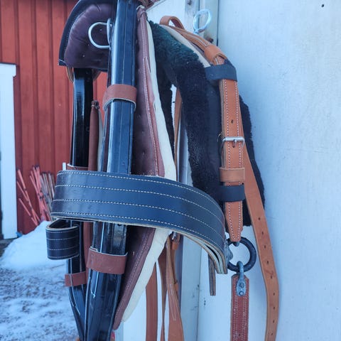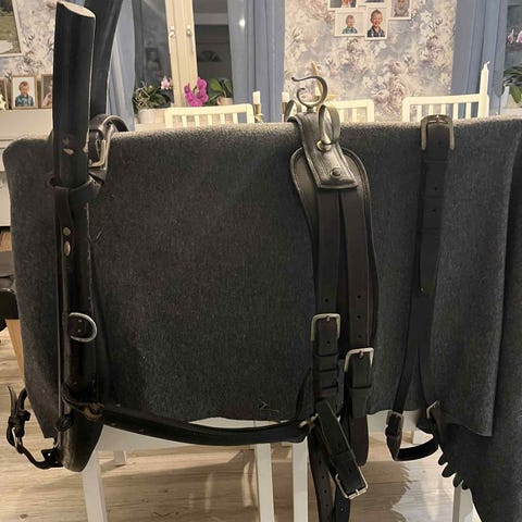 Äldre rejäl bruksele från Tärnsjö märkt med Trekronor. Förzinkad och ledad bågdäckel. Snedremmar, loktömringar samt ryggstycke och svanskappa. Svanskappan är torr i lädret så den bör bytas. Inklusive rejäla seltungor med selpinnar. Ställbara dragläder.