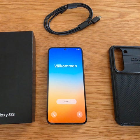 Samsung Galaxy S23 Smartphone med 128 GB lagringsutrymme i svart färg. Glaset fram och bak är helt med tecken på användning på ramen. Några mindre repor. Märks inte vid vanlig användning. Använder alltid skärmskydd och skal. Kommer med boxen och en usbc kabel. Säljs i befintligt skick.