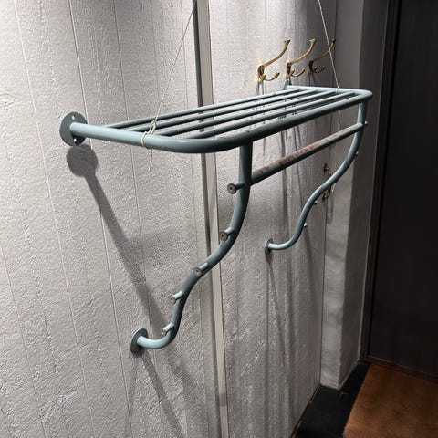 Hatthyllan är 120 cm bred, 23 cm djup, 26 cm hög