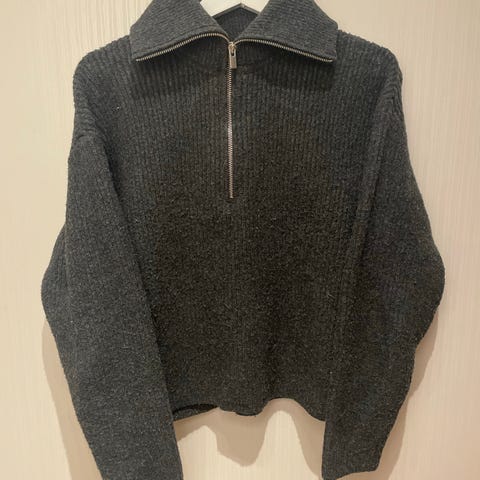 Grå, ribbstickad tröja med hög krage och dragkedja framtill. Jättemjuk! Nästan oanvänd.