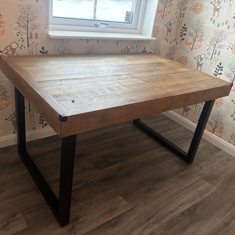 Utdragbart bord 140–180 cm, robust trä med svart metallunderrede. Inga repor eller skador.