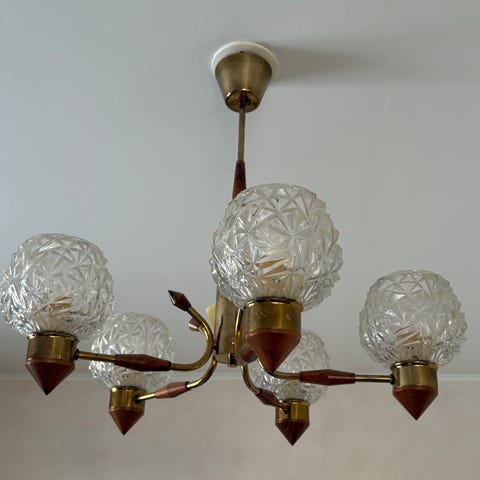 Flerarmad taklampa från (gissningsvis) 1960-talet med detaljer i trä och metall. Alla kupor är hela och elen fungerar.