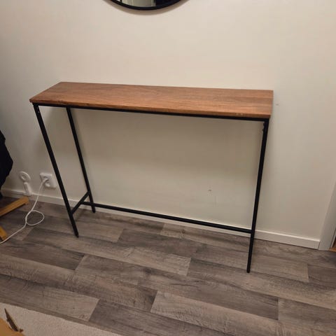 Ett avlastningsbord med metallben och en laminerad skiva i grå sten