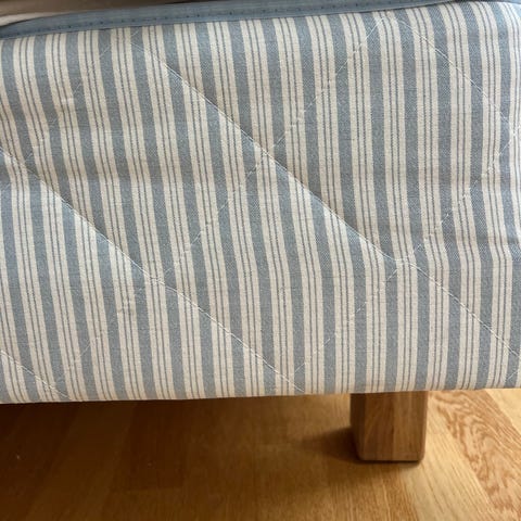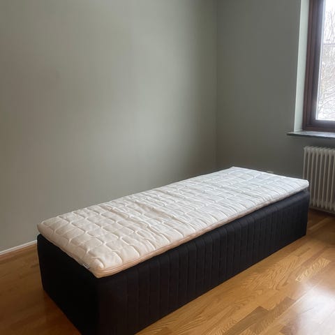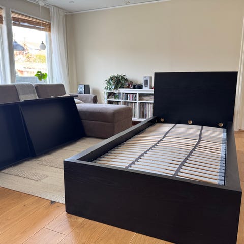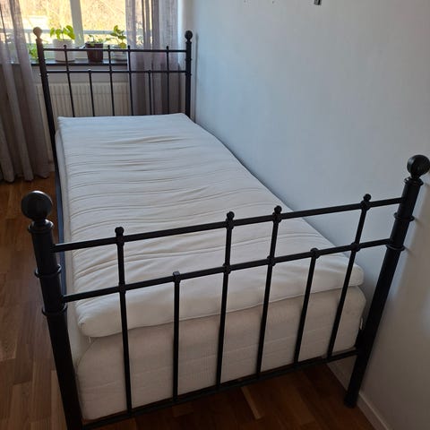 Sängen är väl använd men hel och fullt fungerande, inga trasiga delar eller strukturella skador. Normal bruksslitage förekommer.