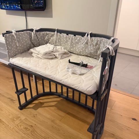 Säljer mörkgrå bedside crib med vaggfötter från Britax. Hjul medföljer också om man hellre vill ha det. Madrass, lakan och spjälsängsskydd från NG Baby ingår också.