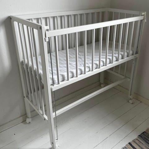 Bedside crib med vaggfötter, hjul, madrass, lakan och spjälsängsskydd