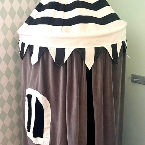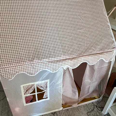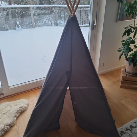 Ett ihopfällbart lektält med fint mönster på utsidan. Tältet har pinnar som håller upp det och en lucka att komma in i. På ett ställe har det ett hål vid kanten men annars finns inga hittade trasig heter. Helst ska det hämtas och inte levereras.