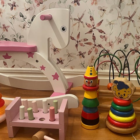 Leksaksstrykbräda med två stycken strykjärn- ett retro och ett som lyser och låter. Mycket fint skick.