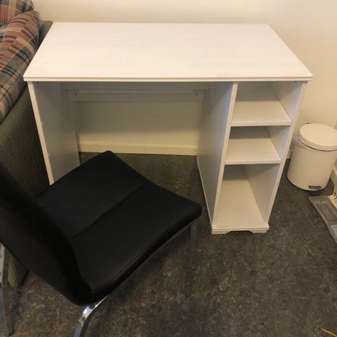 Jysk skrivbord i grå färg med en låda och ett skåp. Passar för kontors- eller studiemiljö. Tillverkat av material med betongliknande yta.